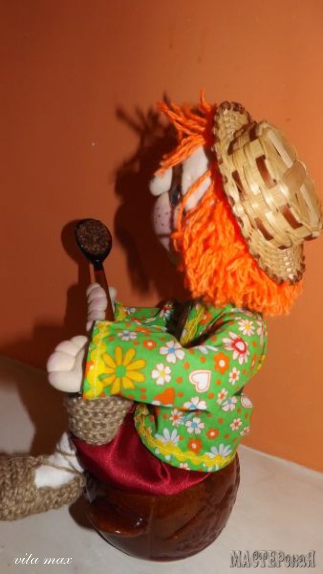 Не совсем я была довольна домовенком Ерошкой!Китайские лапти ему вообще не к лицу были!Парень то русский,одним словом вся рубаха в петухах!Вот и решила я ему новенькие лапоточки связать!Шкодина он у меня такой получился,ну,в итоге на горшке с кашей решил усесться!