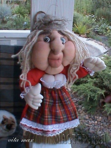 Просто валик из сентипона обернуть капроном,перевязать по центру ,пришить кружева и приклеить горячим клеем на положенное место,повяжем хозяюшке фартук и платок по бабкиежкинскому!