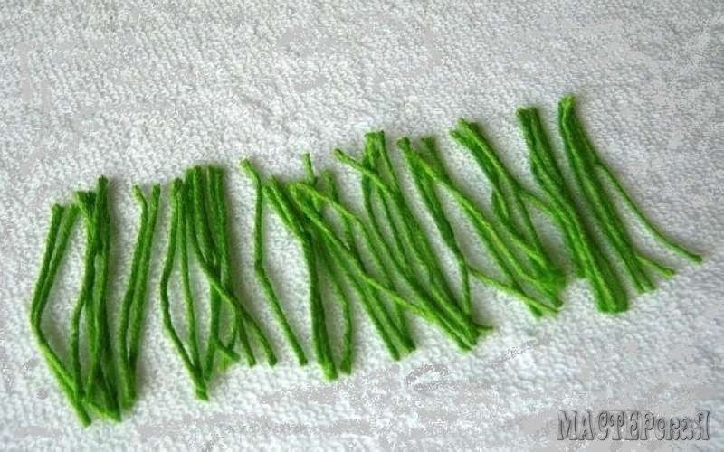 Для чашелистика взять зеленую пряжу, нарезать из нее кусочки длиной 3-4 см