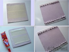 Цветную бумагу нужно пробить дыроколом и по периметру прострочить на швейной машинке. Только после этого приклеить её к открытке