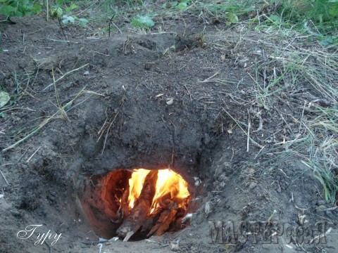 Подобных конструкций довольно много, есть и просто ямка с использованием камней, и просто ямка без поддувала только с использованием дымохода, но в варианте с камнями по близости должны быть камни, а без поддувала нужно делать больше отверстие основное, что-бы воздух поступал но тогда не очень удобно ставить на огонь кастрюлю или чайник т.к. они попросту проваливаются соответственно нужно делать колышки что-бы как-то подвесить, а здесь самый простой вариант но очень эффективный....