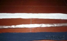 Для того чтобы коврик выглядел аккуратно, края полосок надо загнуть внутрь и либо прострочить на швейной машинке, либо заутюжить. В результате ширина полоски должна составлять 1/3 от начального размера. Одинаковые по цвету полоски сшиваются вместе, края заутюживаются, после чего полоски сматываются в клубок для удобства при плетении.
