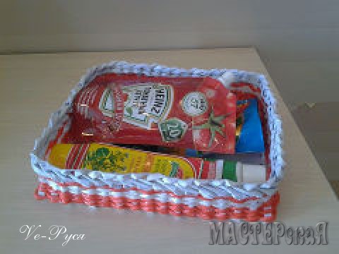 Подносик, симпатичный и практичный, то есть нужный в хозяйстве! Дно из пластика, под трубочки дыроколом сделаны отверстия. Обплела шнуром полипрпиленовым, потом загнула трубочки, покрыла загибку лаком, появилась жесткость в верхней части. Все, можно пользоваться!