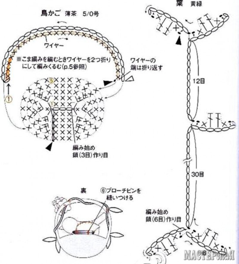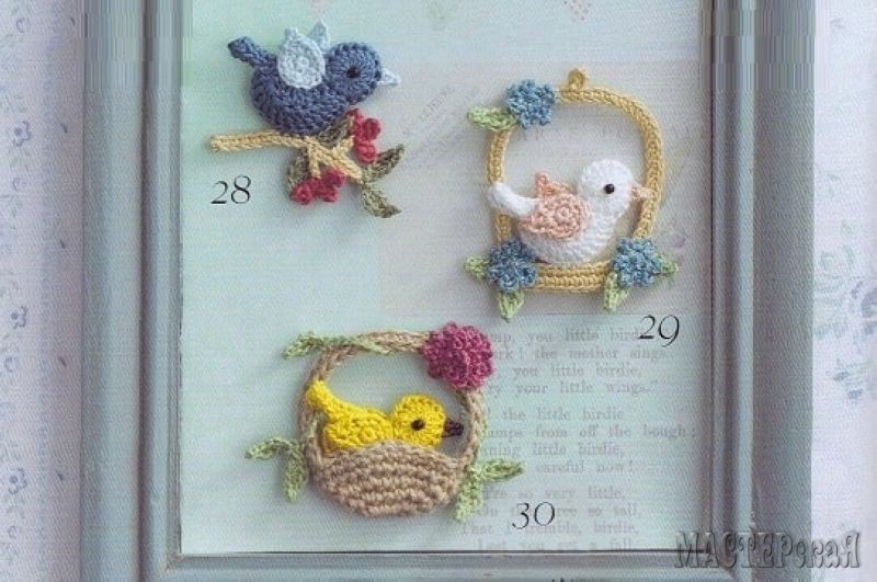 Птички крючком: на ветке, в клетке, в корзинке. Таких птичек можно связать в качестве оригинальной брошки для украшения одежды или для декорирования ободка или заколки для волос маленькой принцессы.