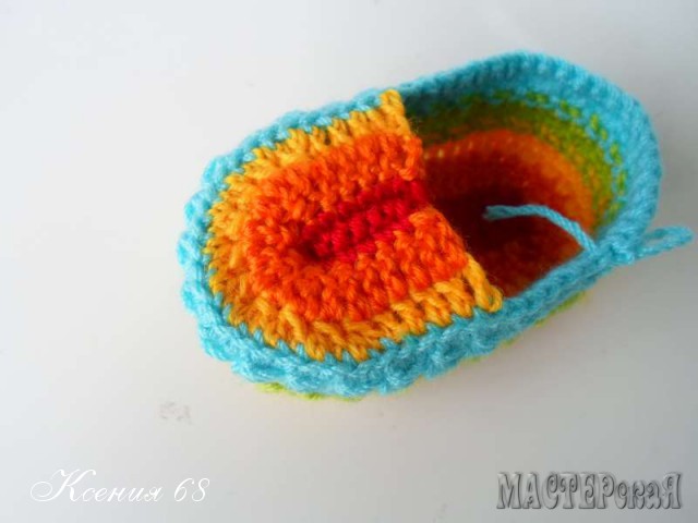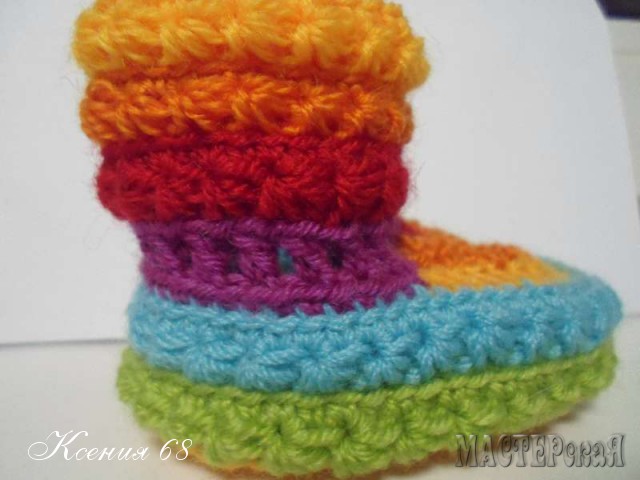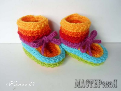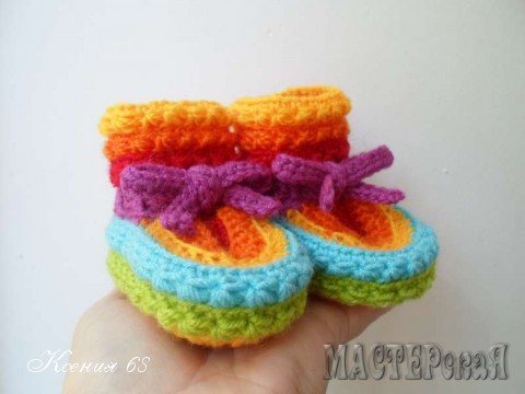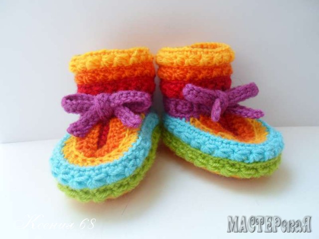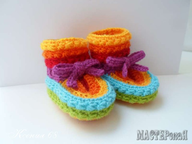 На создание этих радужных пинеток меня сподвигло фото, найденное в интернете. Мастер-класса не было, а меня сильно смущало вязание мыска. Но я нашла другое решение и мне самой оно понравилось даже больше оригинала
