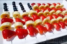 Инструкции: Взять 12 палочек, насадить на каждую сначала малину, затем добавить кусочки апельсина, ананаса, по 2 штуки черники и виноград.