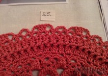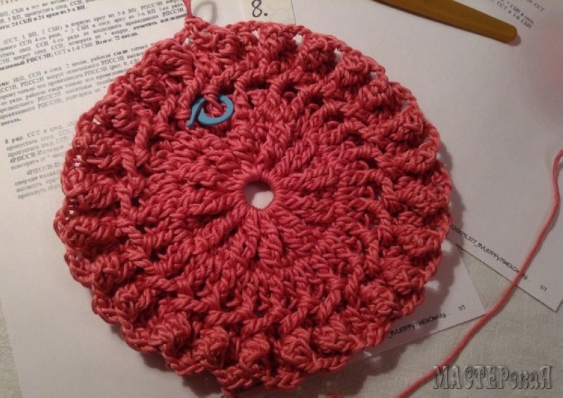 Про 23 ряд! 23 ряд. Соединительная петля выполняется в петлю выполненную, последней в прошлом ряду вяжем ее сзади вперед вокруг указанной петли, 2 ВП, Рельефный столбик с 1-м накидом, расположенный за работой (РЗССН) выполнить в туже петлю (т. е. в последнюю петлю 22-го ряда связали два элемента), работая позади Рельефного столбика с тремя накидами, расположенного перед работой(РПСС3Н) который был выполнен последним в 22-м ряду вяжем РПСС3Н в отмеченный РПСС3Н вытягивая столбик под и в сторону последнего сделанного РПСС3Н,* пропустить следующий РПСС3Н, выполнить КЛАСТЕР в следующий ССН (= два Рельефных столбика с 1-м накидом, расположенные за работой и провязанные вместе), работая позади пропущенного РПСС3Н, выполнить РПСС3Н в РПСС3Н перед пропущенным РПСС3Н, вытягивая столбик под и в сторону пропущенного РПСС3Н; повторять от * по кругу до 2-х последних петель, пропустить РПСС3Н выполненный первым в ряду, КЛАСТЕР вокруг последнего ССН, работая позади пропущенного РПСС3Н, выполнить РПСС3Н в РПСС3Н перед пропущенным РПСС3Н, вытягивая столбик под и в сторону пропущенного РПСС3Н; соединить соединительной петлей с первым РЗССН.Если проще сказать мы столбик с накидом предыдущего ряда обвязываем сзади кластером, а спереди рельефным столбиком.
