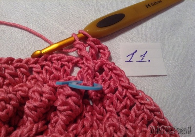 11 ряд. 3 ВП, ССН в следующий ССН, выполнить Первый шаг Убавки СС3Н в отмеченный СБН девятого ряда, пропустить следующий СБН, выполнить Второй шаг в следующий СБН, ССН в следующие два ССН десятого ряда, работая перед Вторым шагом Убавки СС3Н связанной последней, выполнить Первый шаг Убавки СС3Н в пропущенный СБН девятого ряда позади Второго шага первой Убавки СС3Н (т. е. пальчиками отодвигаем Второй шаг к себе и вяжем Первый шаг следующей Убавки), * выполняем Второй шаг в следующий свободный СБН 9-го ряда, ССН в следующие два ССН 10-го ряда, работая перед Вторым шагом Убавки СС3Н выполненной последней, выполнить Первый шаг Убавки СС3Н в тот же СБН куда был связан Второй шаг первой из двух последних Убавок СС3Н: повторять от *….