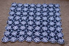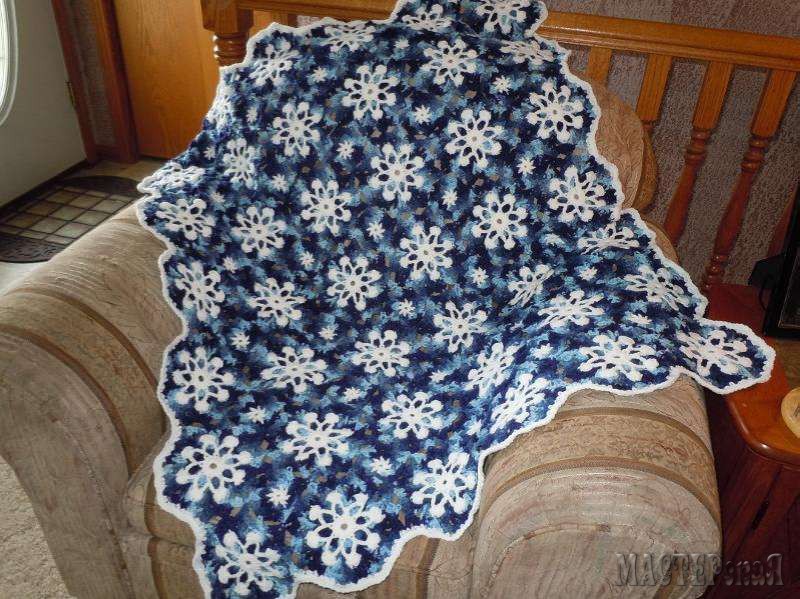 Роскошный плед со снежинками связан крючком из отдельных шестиугольных мотивов с белыми снежинками на синем фоне. Мотивы соединяются между собой в процессе вязания последнего ряда столбиками без накида с воздушными петлями. Схему вязания мотивов можно также использовать для вязания покрывала, подушки или шали.