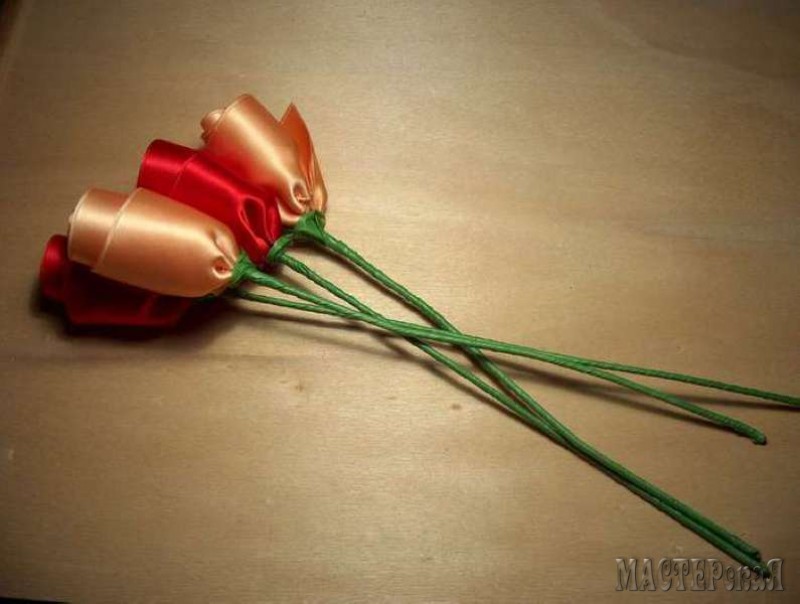 Затем оборачивая ленту вокруг проволоки стягивате ее за нить равномерно укладывая будущий цветок