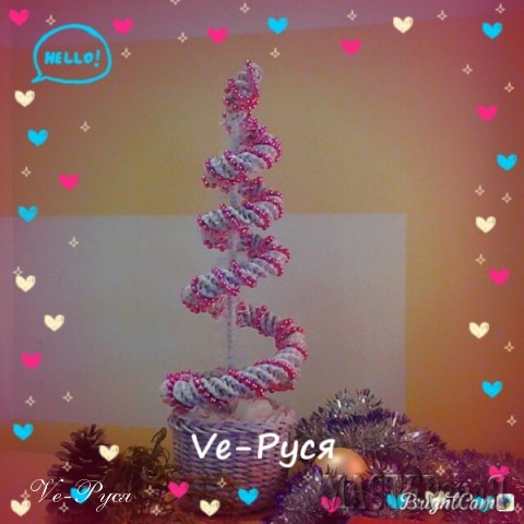 Спасибочки! )))))))) Мне самой нравится, в живую она еще интереснее! даже покрутить ее можно))) ( по секрету как пришла идея: увидела фото в интернете - проволоку закручивают по спирали и белый капроновый шнур натягивают на нее. И на подставочку - и игрушки вешают - а я в плетеночку все повернула !! Скоро Новый год!!