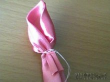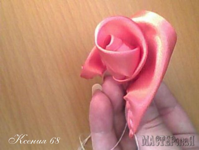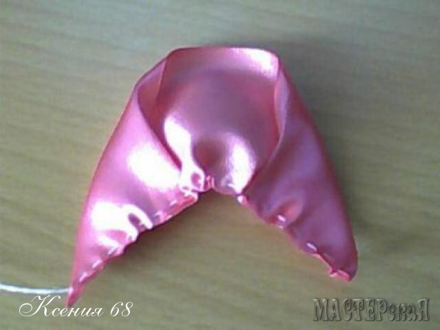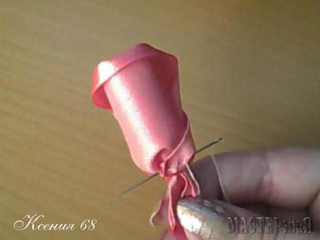 Отгибаем верхний край ленты и складываем в бутон. Фиксирум ниткой.
