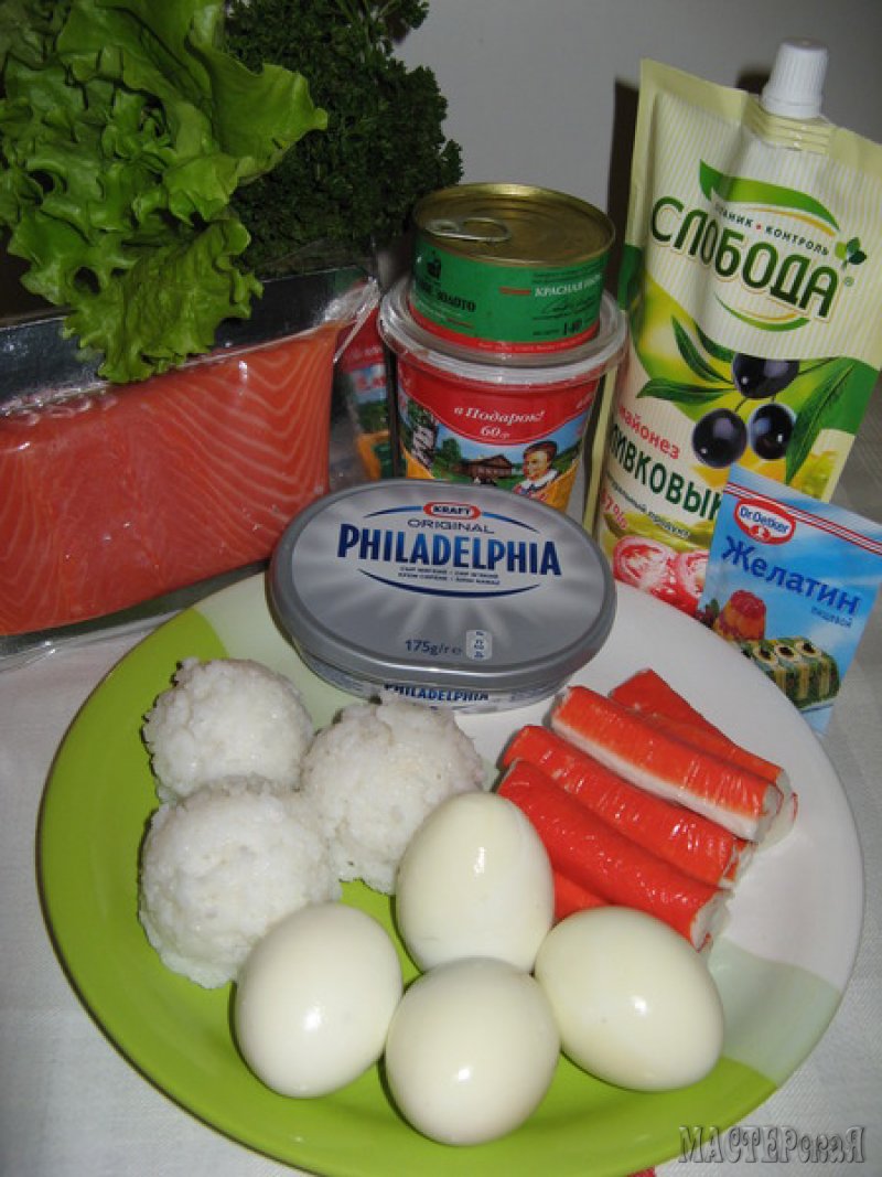 3. Рыбу нарезать на полоски, выложить их на дно и стенки формы.