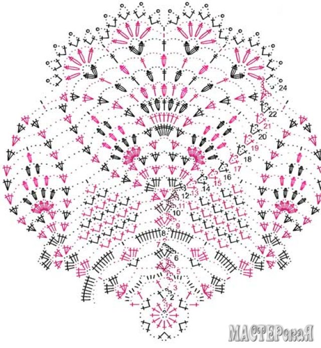 При необходимости выполнять соед. ст. перед началом следующего кругового р. На схеме приведена только часть салфетки, круговой ряд заканчивать по узору. Цифры обозначают круговые ряды.