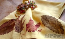 Для изготовления таких салфеток нужна краска для ткани и листья. Перед использованием листья нужно на один день поместить между страницами книги. Листья не должны быть сухими, понадобится их эластичность. И они должны быть прямыми.