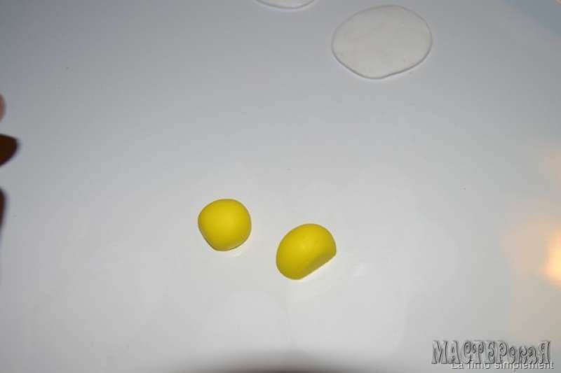Из желтой пластики делаем шарик такого же диаметра как и белые щарики
