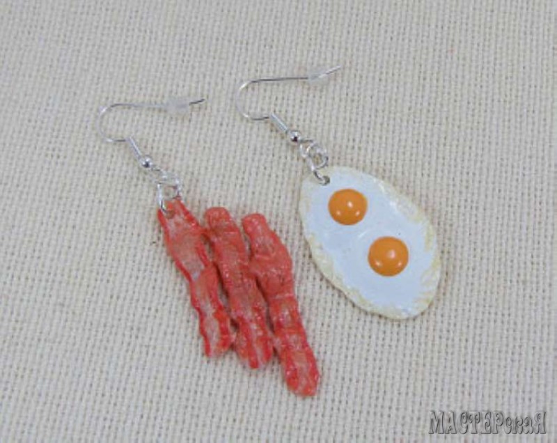 После обжига покройте изделие стекловидным или глянцевым лаком. В отверстие заготовок проденьте соединительные колечки и закрепите в них швензы.Оригинальные и озорные серьги готовы!