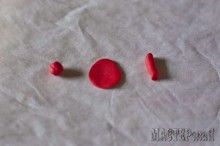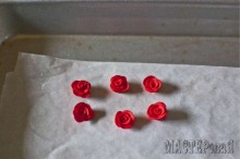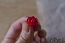 Хорошо разомните красную глину, чтобы она стала пластичной и податливой. Обратите внимание – перед лепкой нужно обязательно вымыть руки, так как на пластике могут быть видны даже незначительные загрязнения. Теперь скатайте маленький шарик из пластики, расплющьте его между пальцами и получившуюся лепешечку скатайте трубочкой, как показано на фото. Это будет сердцевина розы.