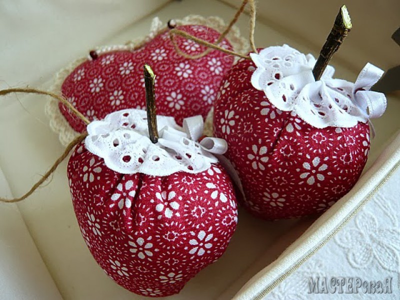 Из небольших остатков ткани можно сшить отличное украшение для кухни - яблочки. Корзинка разноцветных текстильных яблочков на столе украсит любой интерьер. Расцветка ткани может быть любой - на ваш вкус. А для листиков можно взять фетр, плотный флис или х/б ткань зеленого цвета.