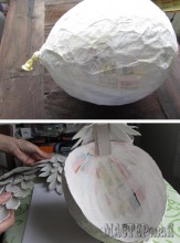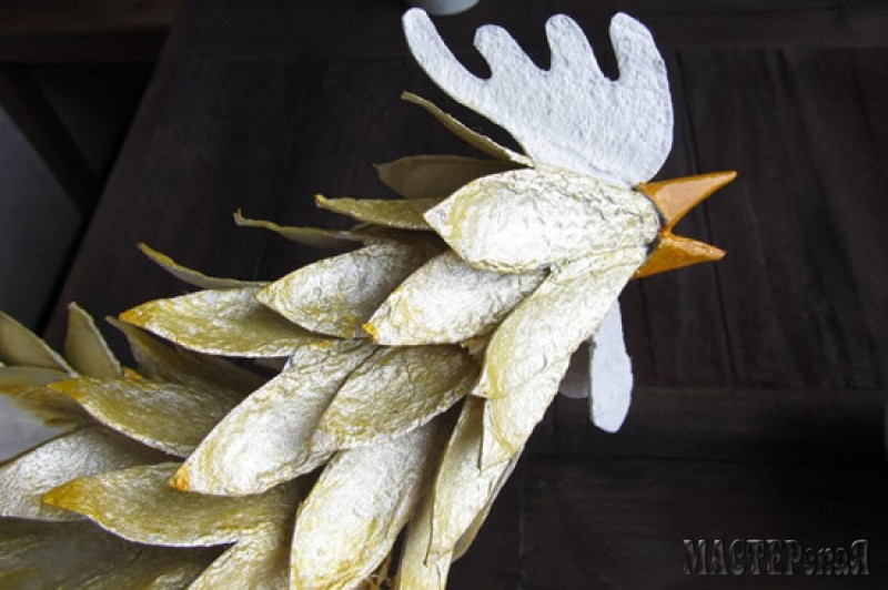 Тело петуха - это папье маше. Делаем его с помощью воздушного шарика, газет и клея ПВА. Перья и голову делаем из яичных лотков. Хвост и крылья вырезаем из пакета от молока или картона.Крылья оклеиваем "перьями" из яичных лотков.Всё остальное легко понять по фото мастер классу