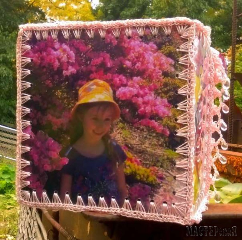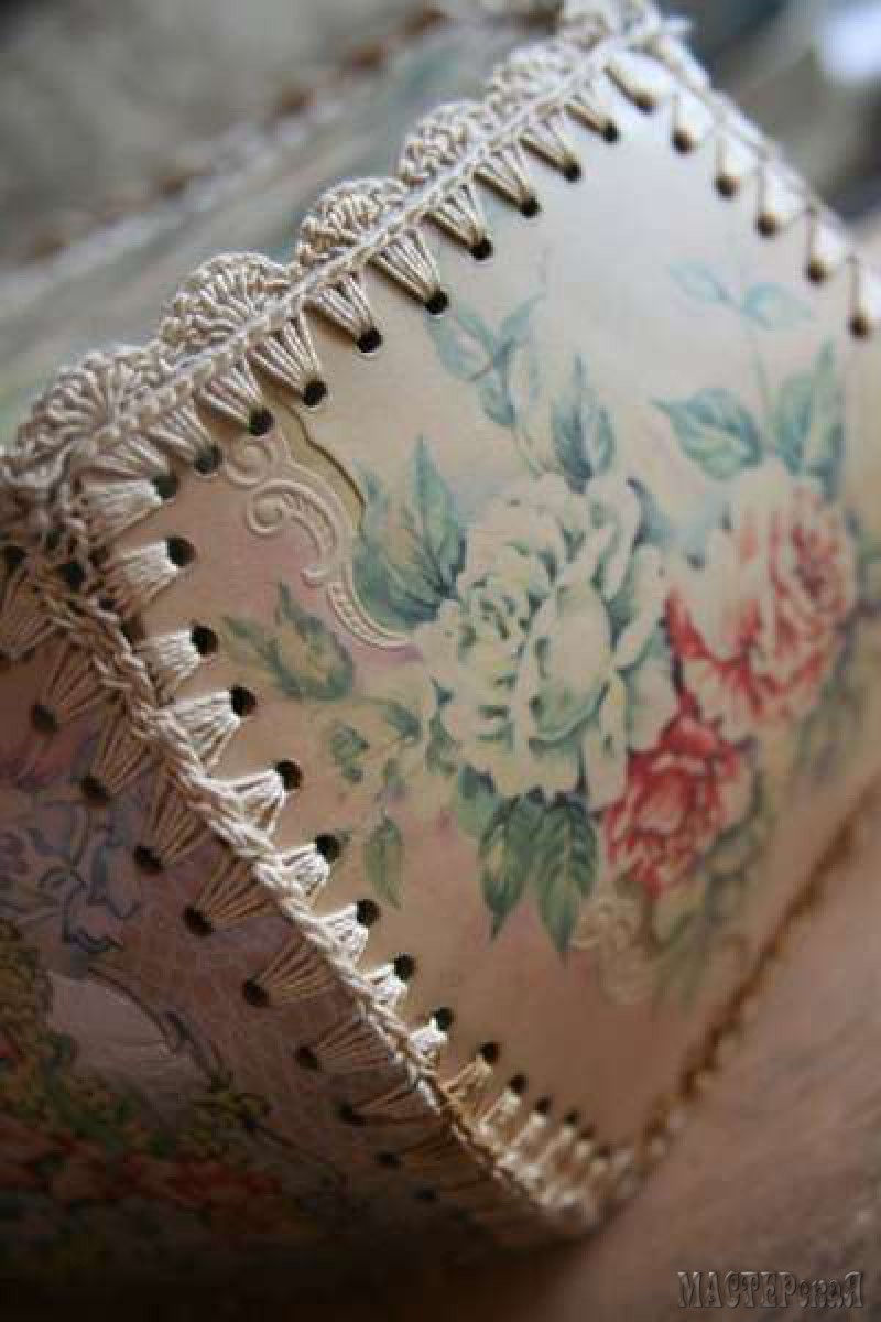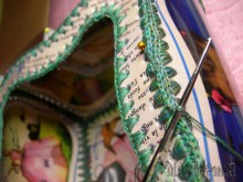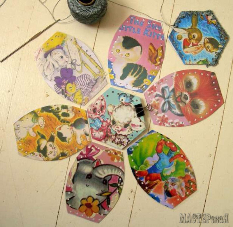Вырезаем заготовки из открыток и по периметру пробиваем отверстия через равное расстояние. Обвязываем заготовки столбиками без накида (в каждое отверстие - 3 ст. б\накида). Затем заготовки сшиваем толстой иглой нитью того же цвета.