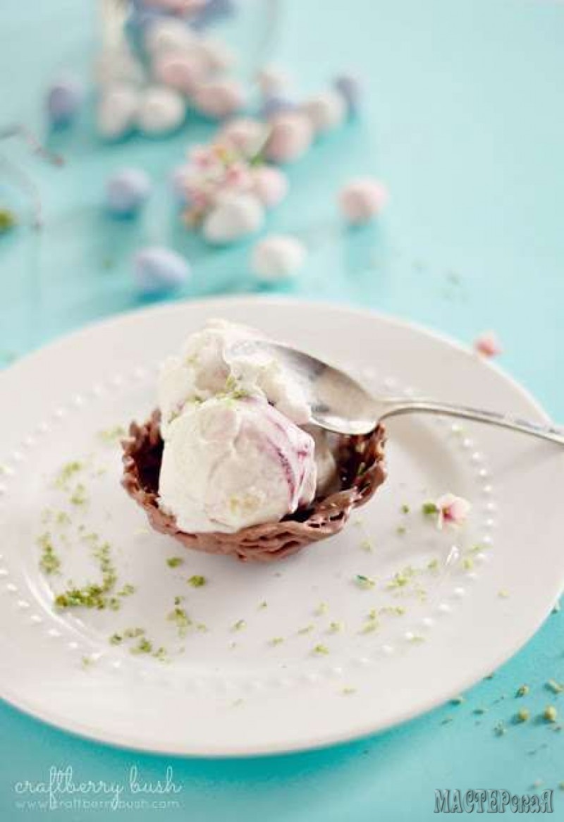 Удивите гостей необычными корзинками из шоколада. Вам понадобится форма для кексов, пищевая плёнка, шоколад, холодильник и фрукты. Растапливаем шоколад на водяной бане, наполняем им или кондитерский шприц или кулёчек с отверстием на конце. Форму от кексов переворачиваем вверх дном. Оборачиваем плёнкой все выпуклости. Теперь поливаем шоколадом форму и отправляем в холод до полного застывания шоколада. Достаём очень аккуратно, чтобы не повредить хрупкие шоколадные стенки. Наполняем корзинки порезанными фруктами и украшаем шариком мороженого или сливками. Приятного аппетита вам и вашим гостям!