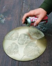 3. Красим тыльную сторону тарелки краской из баллончика. Мы покрасили тарелку с белыми листьями золотой краской, а блюдо с золотыми листьями – белой.