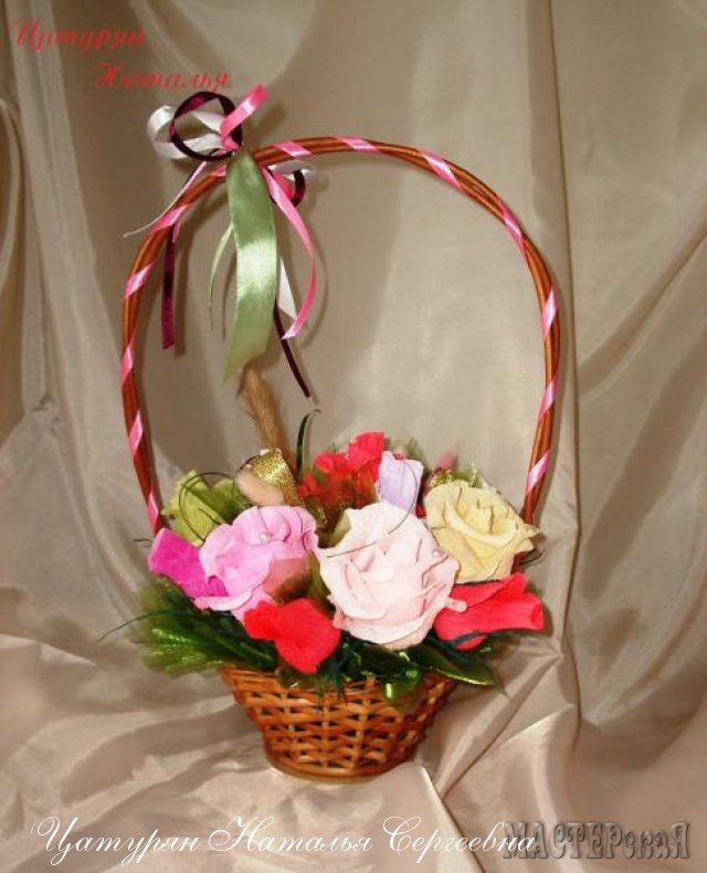 И мне-корзина с красными розами,чайная пара и 4- ""а""!С большой фантазией и оооочень красиво.Из обычной гофры цветы-да?Но выглядят потрясающе!