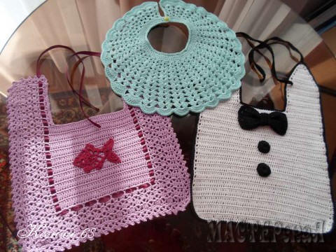 Все слюнявчики связаны х\нитями крючком № 2,5 мм. Схемы аппликаций можно выбрать ЗДЕСЬ.