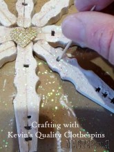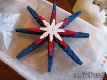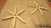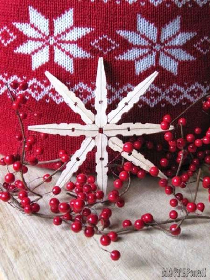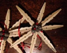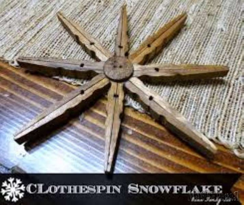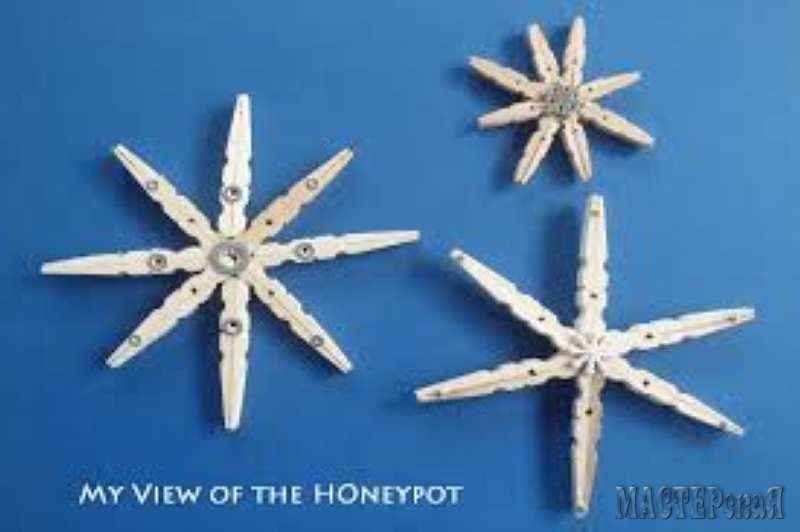 А как вам такие снежикни из деревянных прищепок? Думаю вопрос как их делать ни у кого не возникнет. Главное, прищепку сломать, то есть снять с неё металлическую пружину. А потом можно с половинками прищепок уже работать. А пружинакми потом украсим ёлочку из тех деревянных прищепок.