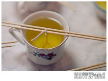 поместите 1 фитиль в центр чашки, придерживая край шампурами. ОЧЕНЬ ОСТОРОЖНО влейте расплавленный парафин в чашку на необходимый вам уровень;