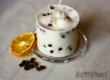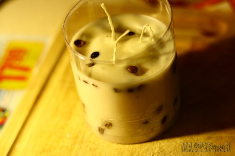 А дальше можно воспользоваться следующим мастер классом. Только в нем свечи делаются из кофейных зерен, но при желании вы можете взять что душе угодно. И сухоцветы в том числе. Если вы делаете свечу с кофе, то добавьте в растопленный парафин ложку растворимого кофе. Если с апельсином, то несколько капель апельсинового масла. Свеча не только будет радовать вас внешним видом, но и приятно пахнуть.
