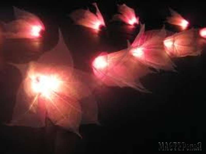Такие листья иногда можно найти и в природе. Однако для красивых букетов лучше изготавливать листья-фантомы из свежих растений. Как скелетировать листья смотрите ЗДЕСЬ А я расскажу о том как сделать гирлянду из таких листьев