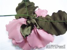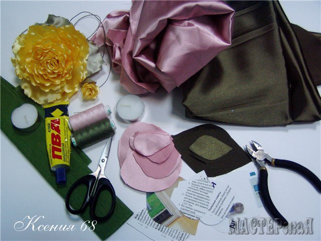 - кусочки стрейч-атласа зеленого цвета для листьев и розового для цветка,