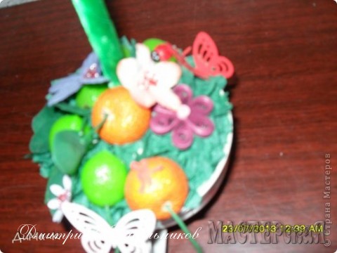 Горшочек. В него на низ положил камни, сверху залито алебастром. Торцевание салфетками, пластиковые фрукты, цветочки для скрапа, квиллинговый цветочек, дырокольные бабочки, стрекозки.