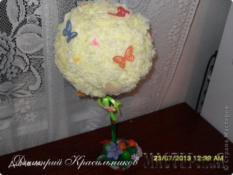 Крона, сделана из салфеточных цветочков, пр мк Марии Кац. Только там из целого круга, а я ещё разрезал. Бабочки летают, стрекозки, всё таки же "Летний одуванчик".