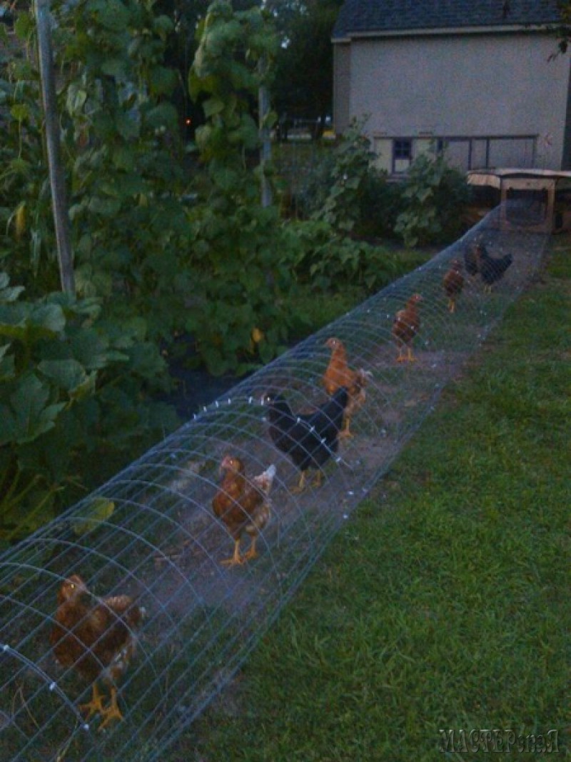Туннель для куриц из сетки. Счастливые обладатели дачных домиков или приусадебных участков знают, что курица – птица неприхотливая, и ее легко разводить в домашних условиях. Но все-таки и она требует некоторой заботы и ухода. Птицы не могут проводить в курятнике круглые сутки. Как и каждому живому существу, им нужно солнышко, воздух и зеленая трава. Если вы опасаетесь за свой огород, но при этом хотите, чтобы ваши куры могли питаться насекомыми и свежей зеленью, то обратите внимание на идею тоннеля с сеткой из металла.Такую конструкцию можно регулярно перемещать по участку, чтобы птицы не вытаптывали одно и то же место. Также металлическая сетка защитит ваших курочек от хищных животных и ястребов.Сетку можно просто сворачивать дугой, а снизу края скреплять либо проволокой, либо леской, чтобы дуга не разворачивалась. Между собой отдельные фрагменты конструкции можно скреплять пластиковыми хомутами, либо все теми же проволокой или леской.