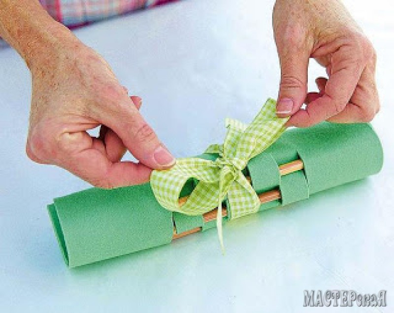 Затем просто вставляем в них крандаши в шахматном порядке. Вот так.Пришиваем ленточки.
