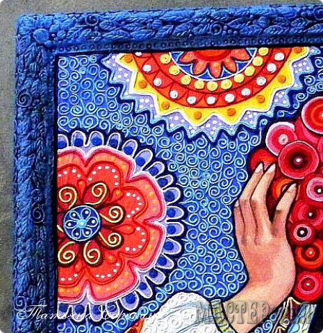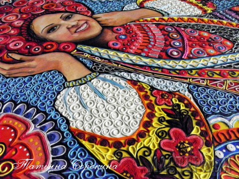 Добрый день, дорогие друзья! Я к вам с новой картиной в цветном пейп-арте. Давно хотелось сделать портрет дочери, но как-то не стандартно... она очень любит культуру нашей страны, вот я и решила сделать её в образе гарной украиночки. Сам портрет написала акриловыми красками, руки и общий рисунок так же прописала красками, затем всё покрыла водостойким лаком и сверху уже все узоры выложила разноцветными бумажными нитями.