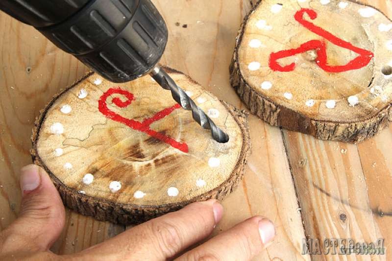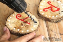 Эта идея больше подходит для загородного дома. Всегда хочется украсить к празднику свой сад. А особенно к Новому году. Но только без мужских рук тут не обойтись. А еще будет нужна старая толстая ветка. Рапилим её на кружки.