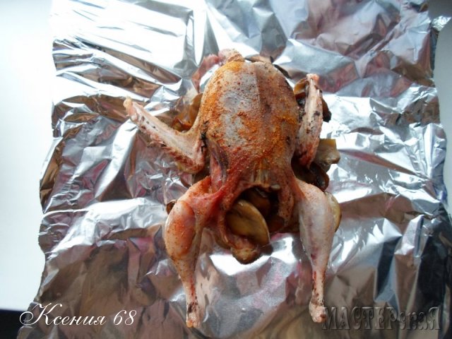 Вальдшнеп, фаршированный грибами ср, 24/04/2013 - 20:50 Способ выводаПосмотреть в виде фото Посмотреть в виде слайдов Фото вальдшнепа выставлять не буду, полюбуйтесь только перышками. Обработанного вальдшнепа замочить в холодной воде на сутки или хотя бы на ночь. Затем обсушить его салфеткой, натереть солью и специями. На сковороде поджарить свежие шампиньоны на сливочном масле. Часть грибов положить на фольгу. На них - вальдшнепа, нафаршированного теми же жареными шампиньонами. Обложить грудинкой И хорошенько завернуть всё в фольгу. Поставить в духовку часа на 1,5 при 180-200 градусах. Готового вальдшнепа немного остудить, затем развернуть. Пока готовила, на улице сильно и резко потемнело ( дождь грозовой пошел) и фото неудачно получились(((((( Птицу разрезаем, кладем на блюдо вместе с грибами и грудинкой. Подавать с отварным картофелем и овощами. Мясо вальдшнепа получается очень нежным. Это настоящий деликатес.Приятного аппетита!!! Опубликовано на masterskaja.net.Копирование с указанием источника приветствуется. Голосование за работу Не понравилось0 Понравилось0 Очень понравилось0 Отлично2 Отправить в Мой Мир Добавить в закладки Яндекс Добавить в закладки Вконтакте Класс! Рассказать в ЖЖ Добавить на Facebook Tweet This! Отправить в Мой Мир Рассказать в LiveInternet Добавить в Google Bookmarks Добавить на MicroBloggy Похожие материалы Курица с медом и... Куриные грудки на... Крылышки в беконе и... Индейка в медово-... Курица по-гурийски пт, 17/05/2013 - 22:28 #1 Наталка эх....хоть разочек бы попробовать(((я даже живьем его не видала сб, 18/05/2013 - 07:22 (Ответ на #1) #2 Ксения 68 Живьем я тоже не видела. Мы на весенней охоте были, вот наши охотники и добыли. Сказали, что вся охота на вальдшнепа длится всего 20 минут. Он небольшой совсем, но мясо - нежное. сб, 18/05/2013 - 09:50 #3 Наталка ой,какой красивенький!!!!