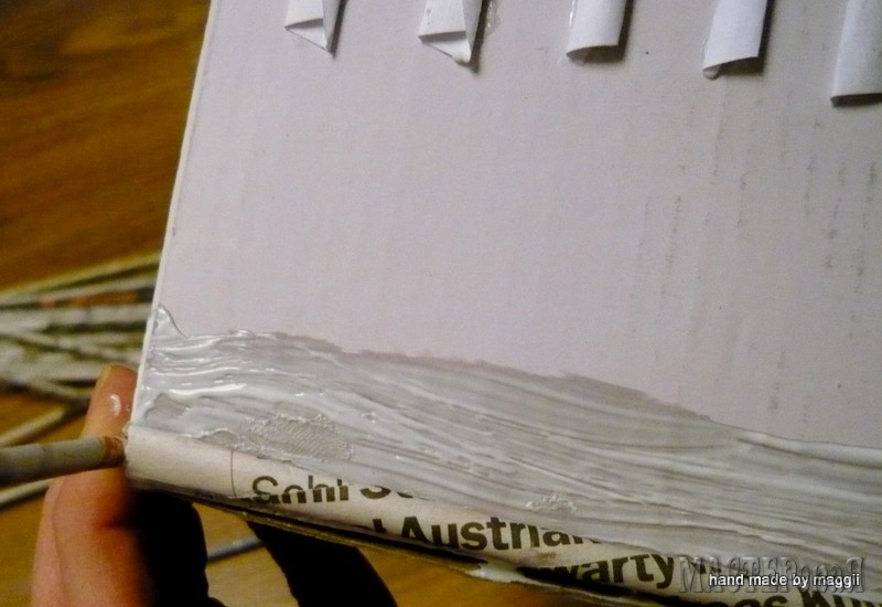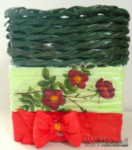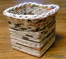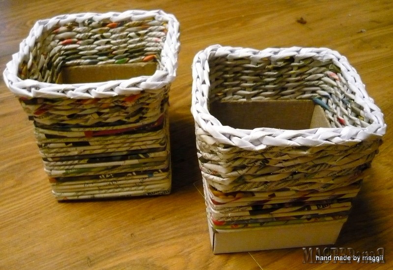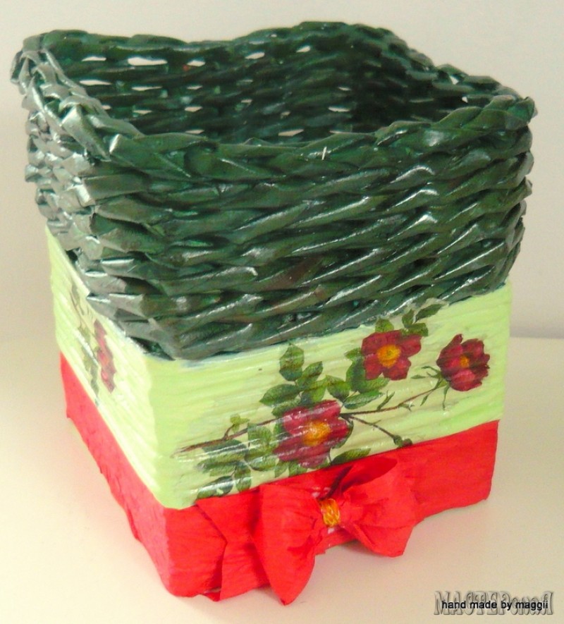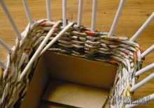 Нашла оригинальную вазочку из газетной лозы. Нужно взять подходящую коробочку, приклеить к ней стойки для плетения. На фото все видно и понятно По материалам handmadebymaggii.blogspot.ru