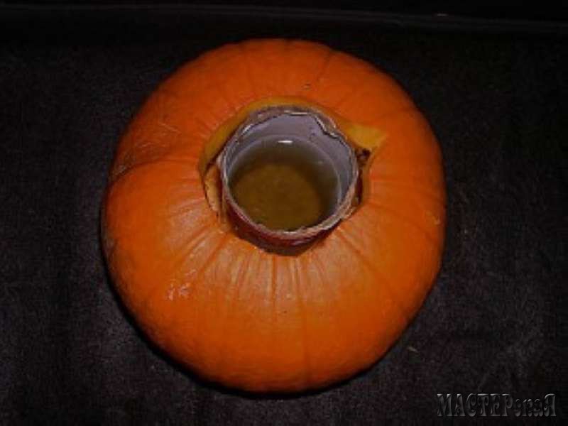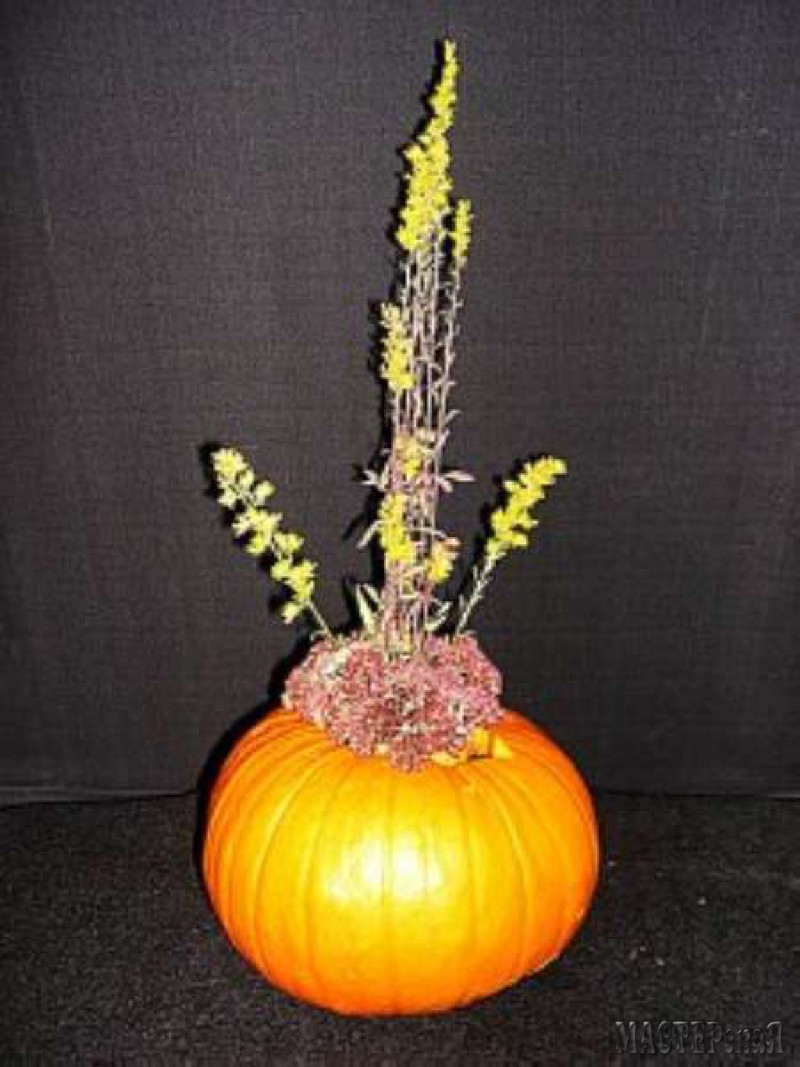 Как вам такая идея: сделать необычную вазу из тыквы и наполнить ее оригинальным букетом с ароматом осени? Результат этого увлекательного творчества впитает тепло вашей души и станет достойным вызовом работам профессиональных флористов. Поместите в вазу из тыквы дары осени из собственного сада или ближайшего парка. Для поделок лучше всего подходят декоративные тыквы, но и обычные небольшого размера молодые тыковки вполне можно использовать. Достаточно срезать с тыквы верхушку, вычистить её и вставить внутрь небольшую вазу, стакан или обычную жестяную банку. Заполните емкость водой - ваза готова.