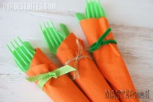 Даже выезд на пикник можно сделать Пасхальным: превратить столовые приборы в веселые морковки! Для этого понадобяться одноразовые пластиковые приборы зеленого цвета, салфетки оранжевого цвета, веревка и тоненькие ленточки для украшения. По материалам ourbestbites.com