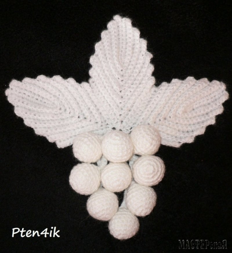 Следующий этап вязания ажурного шарфика. Теперь нужно связать листья и виноградины и собрать их в гроздья: 3 листочка и 9 виноградин. Листья можно связать сразу трехлистники. Предлагаю схемы на выбор для вязания листиков. Для виноградинок можно обвязывать бусины, но будет тяжеловато, шарф ведь легкий, ажурный, тяжелые бусины будут слишком его растягивать. Поэтому можно набить ягодки или силиконом, или остатками пряжи ненужной.