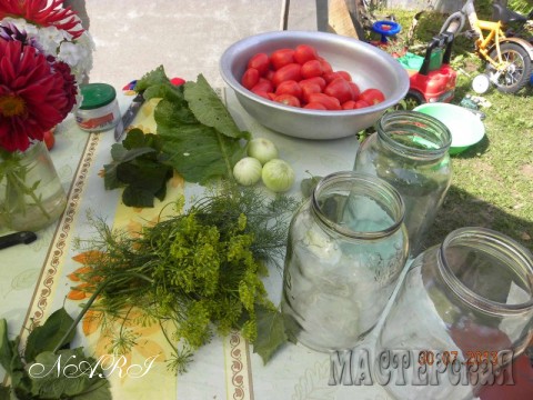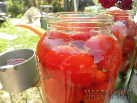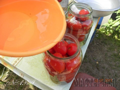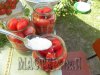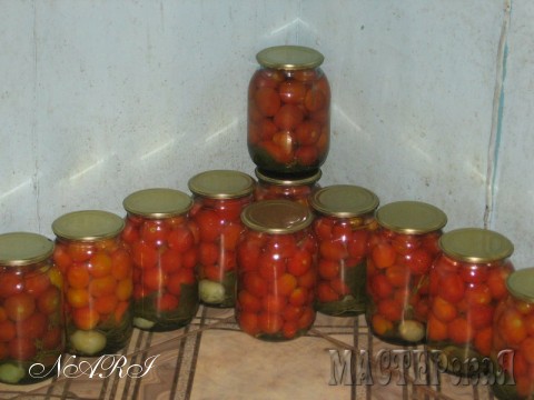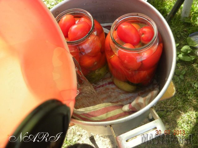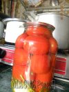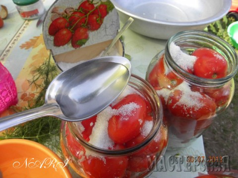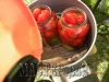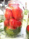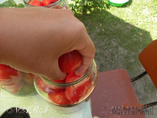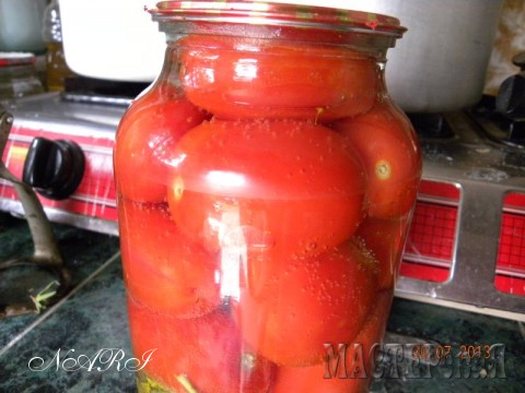 Уложить всё в банку кроме сахара соли и уксуса положить помидоры лучше пальчиковые но можно и любые другие сверху сахар соль залить(холодной) водой до плечиков выше ненадо и уксус и ставим стерилизовать на водяную баню.Как только в банке начнут появляться пузырьки и вода поднимется и начнёт переливатся через край можно закатывать.Очень вкусный рицепт делаю уже лет 6 все рецепт спрашивают .Забыла добавить я добавляю немного побольше уксуса сахара и соли если не добавлять то почти как с грядки а с добавлением гдето по пол ложечки поострее получается.