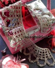 Готовый воротник нужно накрахмалить, расправить и оставить до полного высыхания. Через верхние дужки брюггской тесьмы проденьте узкую атласную ленту.