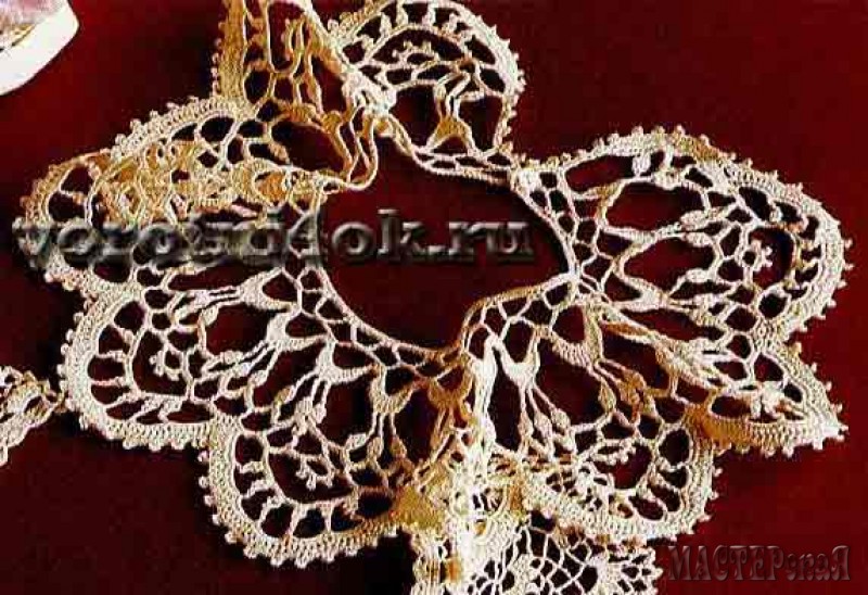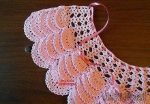 Воротник состоит из 6-ти цветочных мотивов. Каждый цветок обвязан 3-мя рядами арочек, 4-м рядом выполняют соединение мотивов. В последнем ряду арочек по сторонам, которые образуют горловину и низ воротника вяжут меньшее число воздушных петель для выпрямления линий. Линию горловины и низ воротника обвязывают «рачьим шагом».