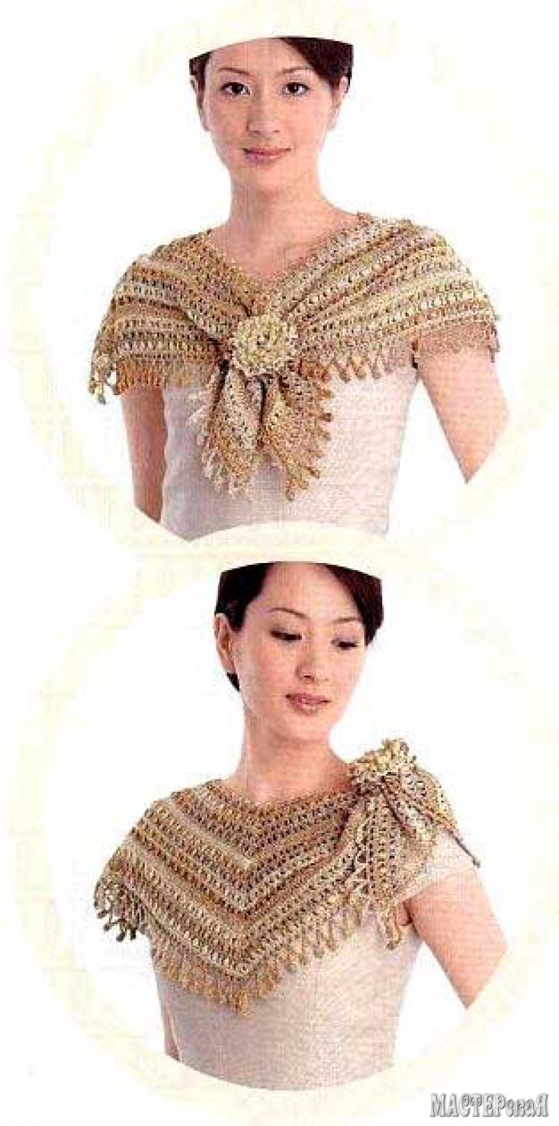 Воротничок из азиатского журнала связан из 100 г пряжи крючком № 2. Ширина воротничка 16,5 см. длина по линии горловины 44 см.