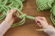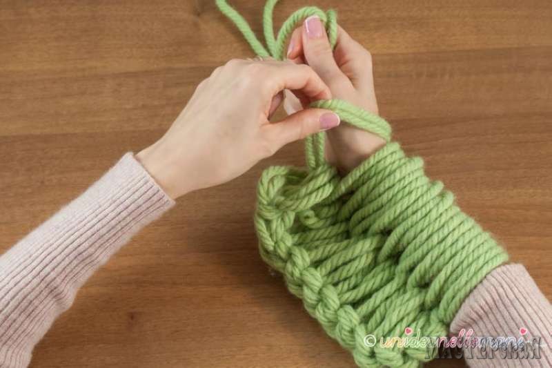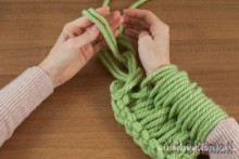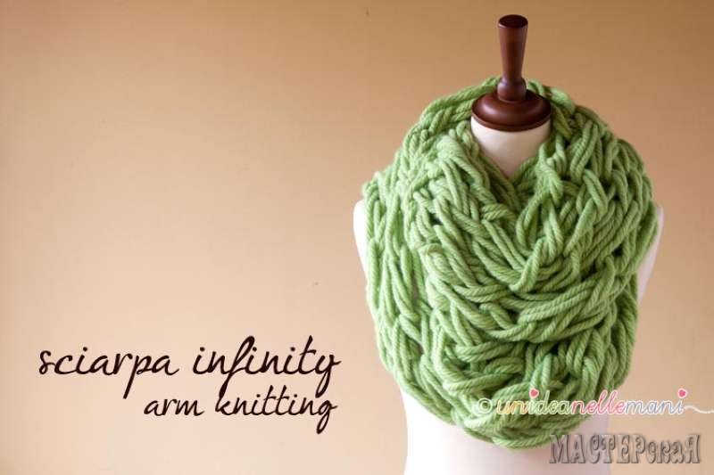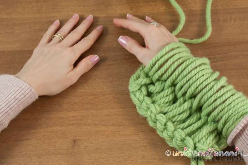 Приступаем к вязанию. Работа у нас получится мягкой, приятной на ощупь и объемной. На самом деле все очень просто, нужно только сосредоточиться и вспомнить как мы вяжем спицами. В данном случае спицами будут наши руки. Вязание начнем с наборного рядя, он будет на левой руке, шарф будем вязать на 10-ти петлях основания.